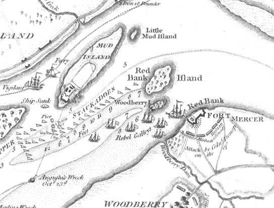 [October 11] -- we halted at Mount Holley [i.e., Holly] & Drew fategue Rum -- this town is 7 miles from burlington -- then we march’d thro Mores town [i.e., Moorestown] 9 miles farther -- then we march’d to Hatten feild [i.e., Haddonfield] & Called Up the people & made fires & Rested a while for we were Verey much fategued with marching -- then we marchd again for the Red Bank -- we march’d 6 miles & made another halt & Drew half Gill of Rum Pr. man -- then marched into the fort [i.e., Fort Mercer] about 4 miles farther & Pitched our tents & Loged Quiet this night -- their hath bin a Continuel fire of Cannon all Day Between the Enemy & our Galleys in the River